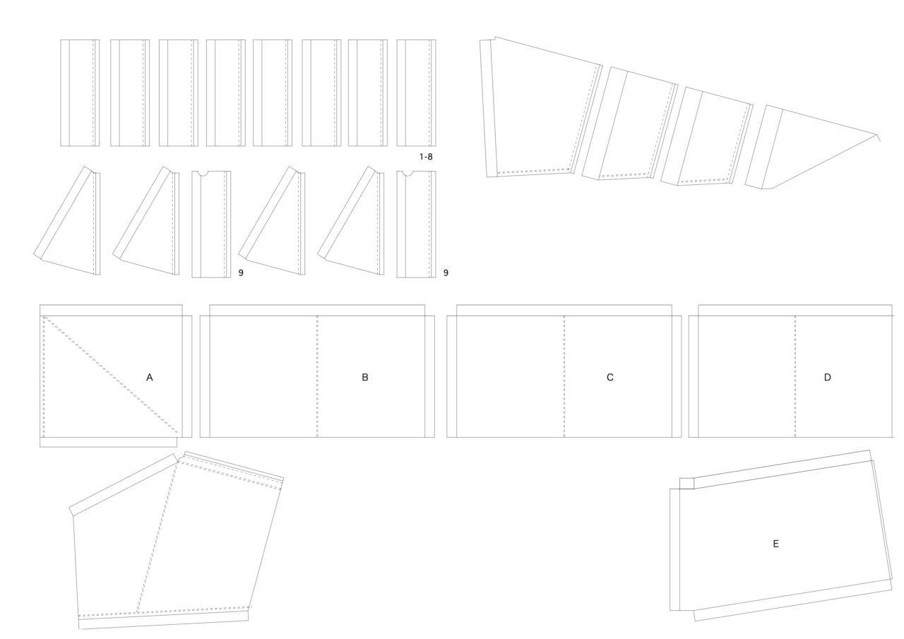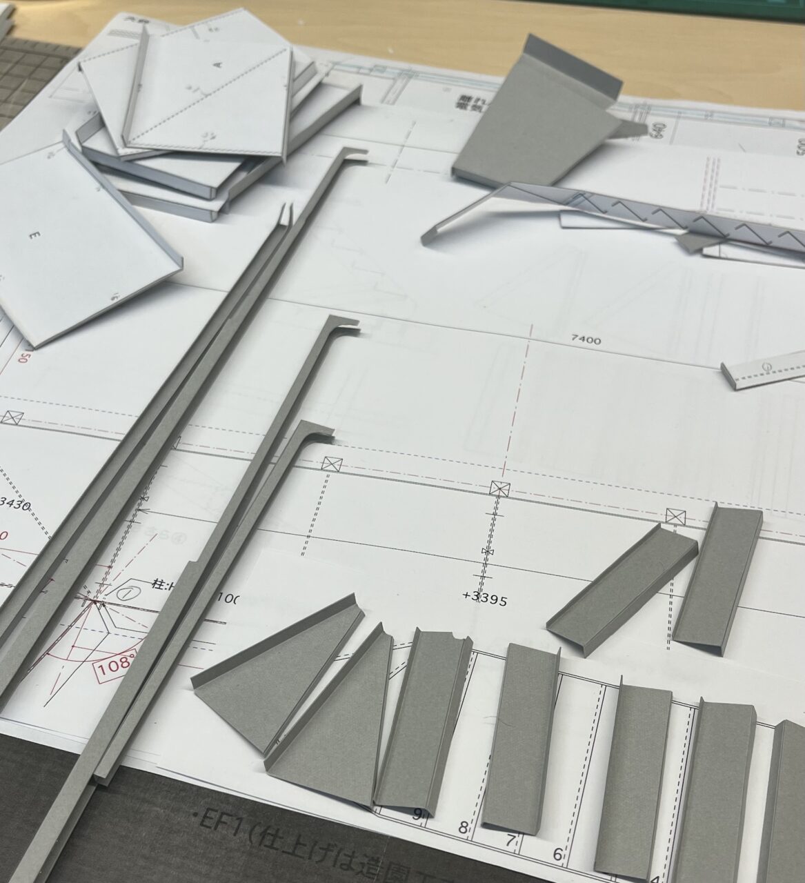 そして、この型紙どうりに部材を切り出してもらい、山折り、谷折り、と部材を切ったり折ったり貼ったりしながら、すべて揃えてもらいます。