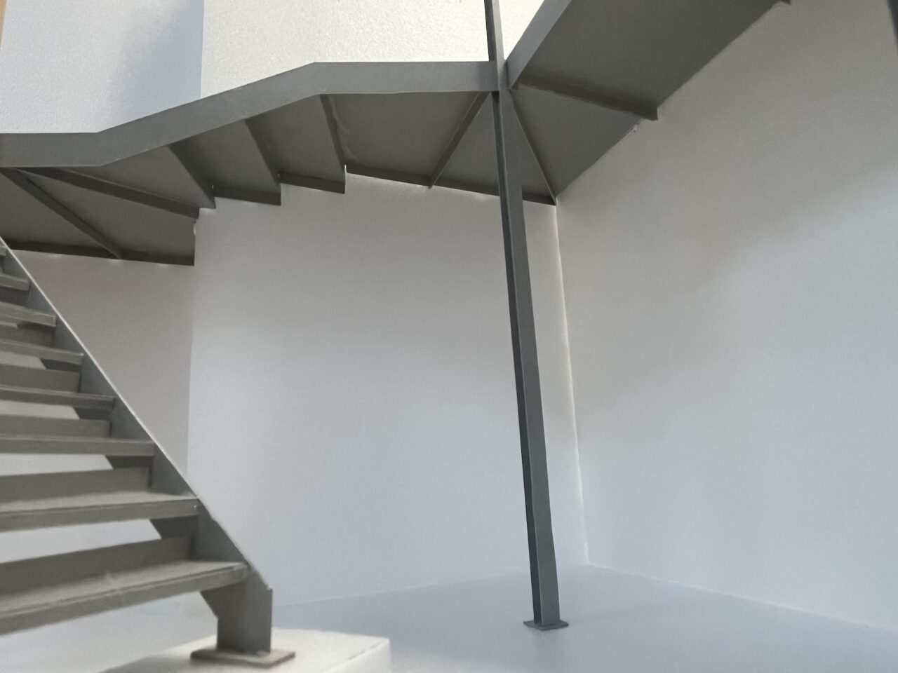 今回は鉄骨の階段。わりと複雑です。図面を描いていた段階から、納まりが詰めきれていない箇所、施工の手順、デザインを悩んでいる箇所、、確認したいことが山盛りでした。